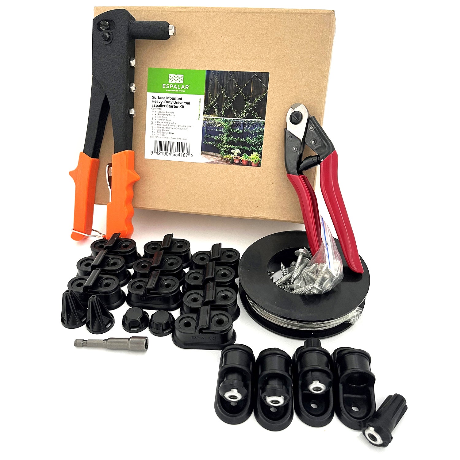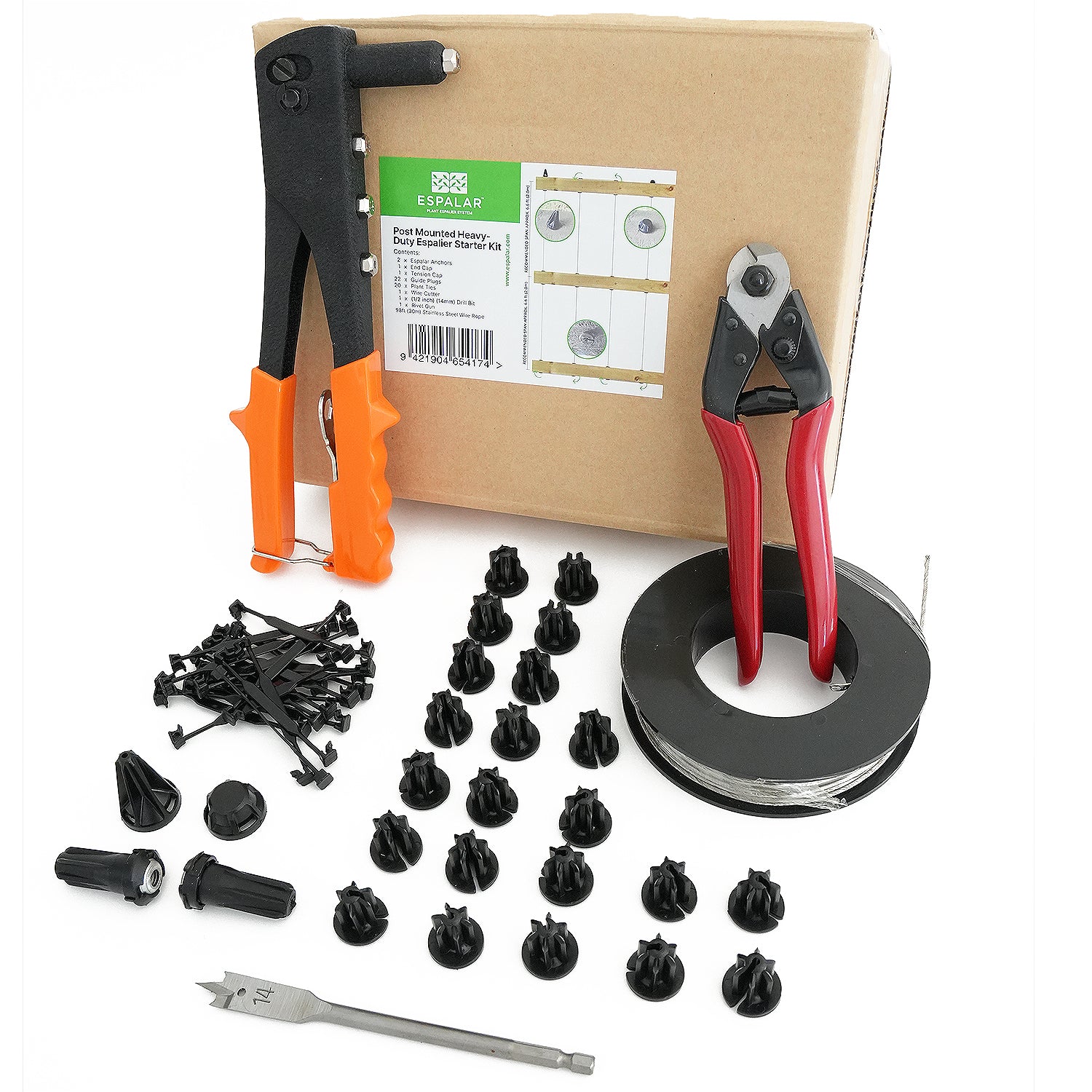 The Espalar universal starter kit is designed to get you underway with your first espalier project and comes with wire cutters, hex driver and rivet gun for tensioning the wires.